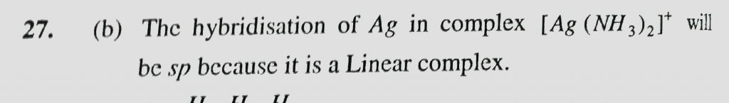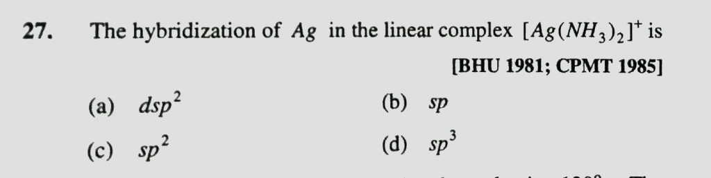 The hybridization of Ag in the linear complex [ Ag (NH3)2 ]^+ is (a) dsp^2 (b) sp (c) sp^2 (d) sp^3 The hybridization of Ag in the linear complex [ Ag (NH3)2 ]^+ is (a) dsp^2 (b) sp (c) sp^2 (d) sp^3 December 6, 2020 Category: Uncategorised (JEE Advanced Physics by BM Sharma + GMP Solutions) , Facebook Messenger WhatsApp Share this:TwitterFacebook Related