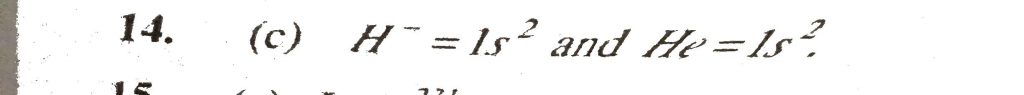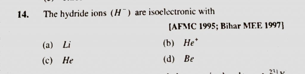 The hydride ions (H^-) are isoelectronic with (a) Li (b) He ^+ (c) He (d) Be The hydride ions (H^-) are isoelectronic with (a) Li (b) He ^+ (c) He (d) Be November 26, 2020 Category: Uncategorised (JEE Advanced Physics by BM Sharma + GMP Solutions) , Facebook Messenger WhatsApp Share this:TwitterFacebook Related