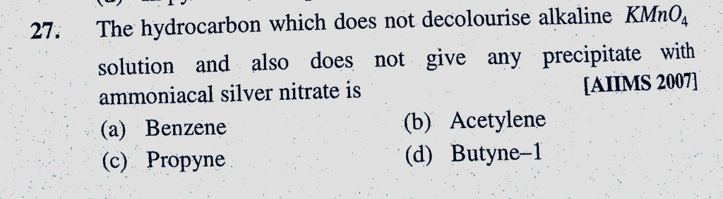 The hydrocarbon which does not decolourise alkaline KMnO4 solution and also does not give any precipitate with ammoniacal silver nitrate is The hydrocarbon which does not decolourise alkaline KMnO4 solution and also does not give any precipitate with ammoniacal silver nitrate is December 15, 2020 Category: Uncategorised (JEE Advanced Physics by BM Sharma + GMP Solutions) , Facebook Messenger WhatsApp Share this:TwitterFacebook Related