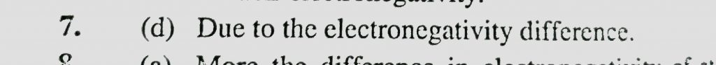 The ICI molecule is (a) Purely electrovalent (b) Purely covalent (c) Polar with negative end on iodine (d) Polar with negative end on chlorine The ICI molecule is (a) Purely electrovalent (b) Purely covalent (c) Polar with negative end on iodine (d) Polar with negative end on chlorine December 2, 2020 Category: Uncategorised (JEE Advanced Physics by BM Sharma + GMP Solutions) , Facebook Messenger WhatsApp Share this:TwitterFacebook Related