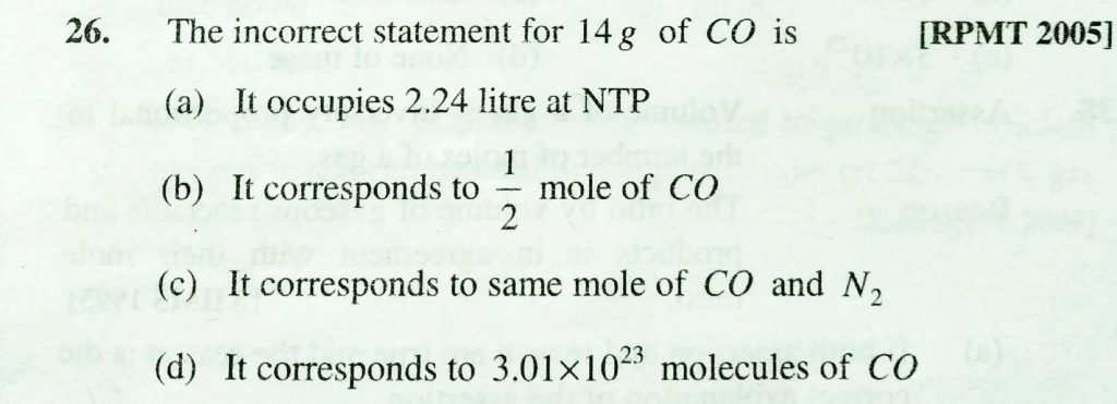 THe incorrect statement for 14 g of CO is (a) it occupies 2.24 l of NTP (b) it corresponds to 1/2 ,mole of CO mole of CO THe incorrect statement for 14 g of CO is (a) it occupies 2.24 l of NTP (b) it corresponds to 1/2 November 22, 2020 Category: Uncategorised (JEE Advanced Physics by BM Sharma + GMP Solutions) , Facebook Messenger WhatsApp Share this:TwitterFacebook Related