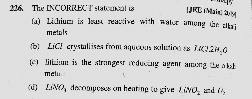 The INCORRECT statement is (a) Lithium is least reactive with water among the alkali metals (b) LiCl crystallises from aqueous solution as LiCl.2H2O The INCORRECT statement is (a) Lithium is least reactive with water among the alkali metals (b) LiCl crystallises from aqueous solution as LiCl.2H2O November 28, 2020 Category: Uncategorised (JEE Advanced Physics by BM Sharma + GMP Solutions) , Facebook Messenger WhatsApp Share this:TwitterFacebook Related