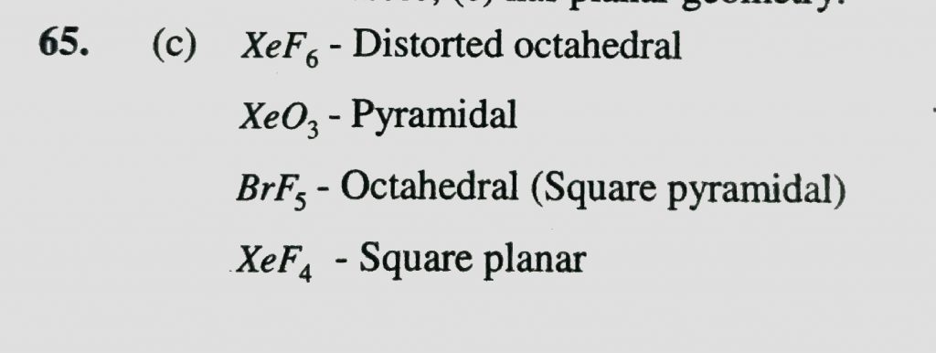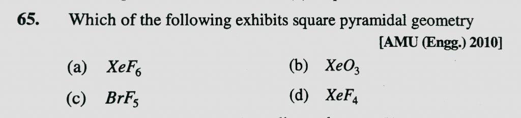 Which of the following exhibits square pyramidal geometry (a) XeF6 (b) XeO3 (c) BrF5 (d) XeF4 Which of the following exhibits square pyramidal geometry (a) XeF6 (b) XeO3 (c) BrF5 (d) XeF4 December 6, 2020 Category: Uncategorised (JEE Advanced Physics by BM Sharma + GMP Solutions) , Facebook Messenger WhatsApp Share this:TwitterFacebook Related