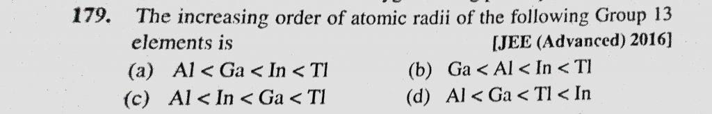 The increasing order of atomic radii of the following Group 13 elements is (a) Al < Ga < In < TI (b) Ga < Al < In < Ti The increasing order of atomic radii of the following Group 13 elements is (a) Al < Ga < In < TI (b) Ga < Al < In < Ti November 28, 2020 Category: Uncategorised (JEE Advanced Physics by BM Sharma + GMP Solutions) , Facebook Messenger WhatsApp Share this:TwitterFacebook Related
