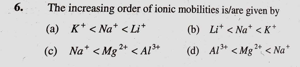 The increasing order of ionic mobilities is/are give by (a) K+ < Na + < Li + (b) Li + < Na + < K+ (c) Na + < Mg 2+ < Al 3+ The increasing order of ionic mobilities is/are give by (a) K+ < Na + < Li + (b) Li + < Na + < K+ (c) Na + < Mg 2+ < Al 3+ November 11, 2020 Category: Uncategorised (JEE Advanced Physics by BM Sharma + GMP Solutions) , Facebook Messenger WhatsApp Share this:TwitterFacebook Related