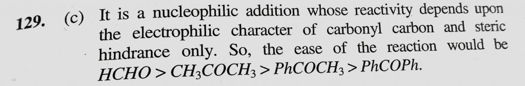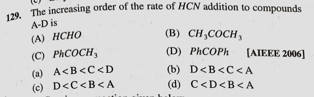 The increasing order of the rate of HCN addition to compounds A – D is (A) HCHO (b) CH3COCH3 (c) PhCOCH3 (D) PhCOPh The increasing order of the rate of HCN addition to compounds A - D is (A) HCHO (b) CH3COCH3 (c) PhCOCH3 (D) PhCOPh February 12, 2021 Category: Uncategorised (JEE Advanced Physics by BM Sharma + GMP Solutions) , Facebook Messenger WhatsApp Share this:TwitterFacebook Related