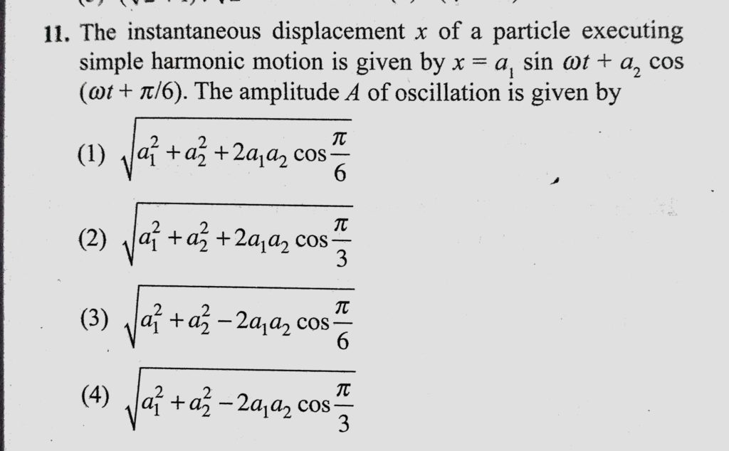 The instantaneous displacement x of a particle executing simple harmonic motion is given by x = a1 sin omega t + a2 cos (omega t + pie / 6). The amplitude A of oscillation is given by The instantaneous displacement x of a particle executing simple harmonic motion is given by x = a1 sin omega t + a2 cos (omega t + pie / 6). The amplitude A of oscillation is given by October 30, 2020 Category: Uncategorised (JEE Advanced Physics by BM Sharma + GMP Solutions) , Facebook Messenger WhatsApp Share this:TwitterFacebook Related