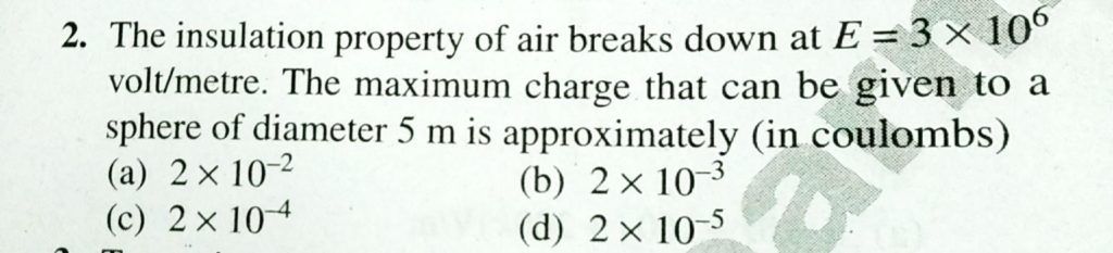 The insulation property of air breaks down at E= 3 × 10^6v olt/meter. The maximum charge that can be given to a sphere of diameter 5 m is approximately (in coulombs) The insulation property of air breaks down at E= 3 × 10^6v olt/meter. The maximum charge that can be given to a sphere of diameter 5 m is approximately (in coulombs) September 15, 2020 Category: Uncategorised (JEE Advanced Physics by BM Sharma + GMP Solutions) , Facebook Messenger WhatsApp Share this:TwitterFacebook Related