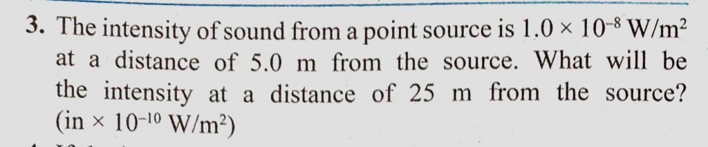 The intensity of sound from a point source is 1.0 * 10^-8 W/m^2 at a distance of 5.0 m from the source. What will be the intensity at a distance of 25 m from the source ? The intensity of sound from a point source is 1.0 * 10^-8 W/m^2 at a distance of 5.0 m from the source. What will be the intensity at a distance of 25 m from the source ? November 8, 2020 Category: Uncategorised (JEE Advanced Physics by BM Sharma + GMP Solutions) , Facebook Messenger WhatsApp Share this:TwitterFacebook Related