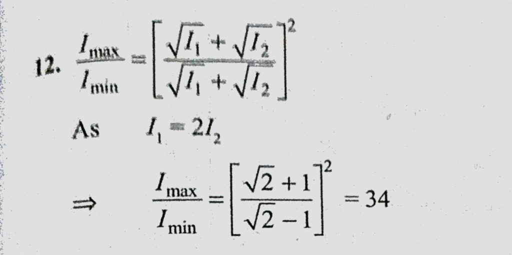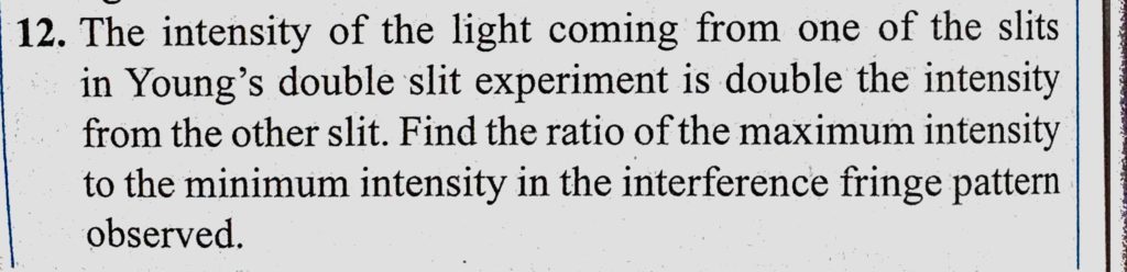 The intensity of the light coming from one of the slits in Young’s double slit experiment is double the intensity from the other slit. Find the ratio of the maximum intensity to the The intensity of the light coming from one of the slits in Young's double slit experiment is double the intensity from the other slit. Find the ratio of the maximum intensity to the October 10, 2020 Category: Uncategorised (JEE Advanced Physics by BM Sharma + GMP Solutions) , Facebook Messenger WhatsApp Share this:TwitterFacebook Related