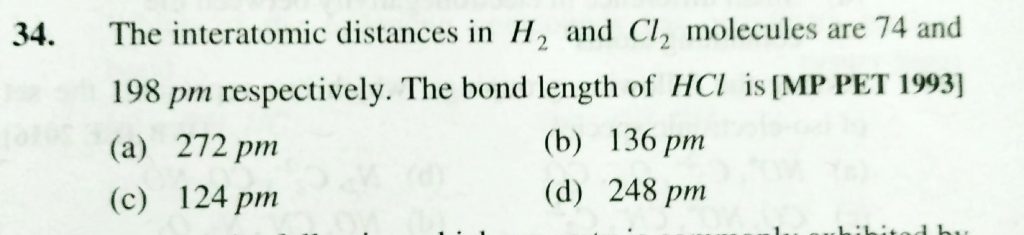 The interatomic distance in H2 and CL2 molecules are 74 and 198 pm respectively . The bond length of HCL is The interatomic distance in H2 and CL2 molecules are 74 and 198 pm respectively . The bond length of HCL is December 1, 2020 Category: Uncategorised (JEE Advanced Physics by BM Sharma + GMP Solutions) , Facebook Messenger WhatsApp Share this:TwitterFacebook Related