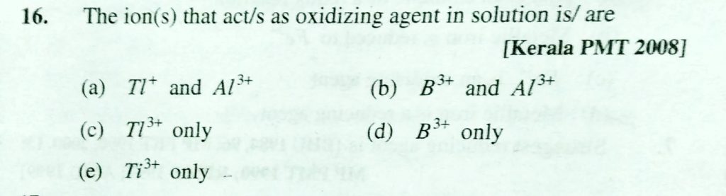 The ion/s that act/s as oxidizing agent in solution is /are (a) Tl^+and Al^3+ (b) B^3+and Al^3+ (c) Tl^3+ only (d) B^3+ only The ion/s that act/s as oxidizing agent in solution is /are (a) Tl^+and Al^3+ (b) B^3+and Al^3+ (c) Tl^3+ only (d) B^3+ only November 23, 2020 Category: Uncategorised (JEE Advanced Physics by BM Sharma + GMP Solutions) , Facebook Messenger WhatsApp Share this:TwitterFacebook Related