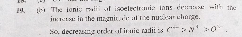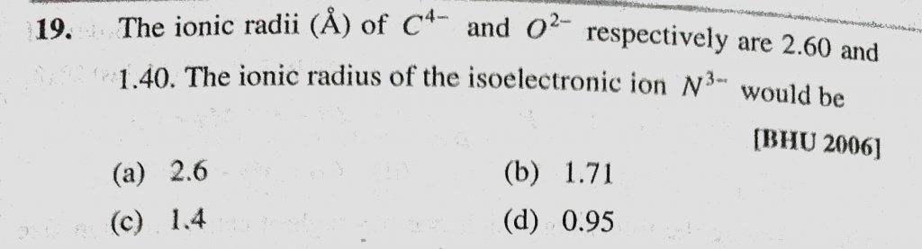 The ionic radii (A) of C 4- and O 2- respectively are 2.60 and 1.40. The ionic radius of the isoelectronic ion N 3- would be The ionic radii (A) of C 4- and O 2- respectively are 2.60 and 1.40. The ionic radius of the isoelectronic ion N 3- would be November 9, 2020 Category: Uncategorised (JEE Advanced Physics by BM Sharma + GMP Solutions) , Facebook Messenger WhatsApp Share this:TwitterFacebook Related