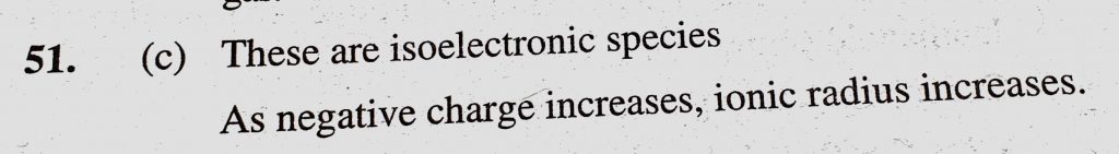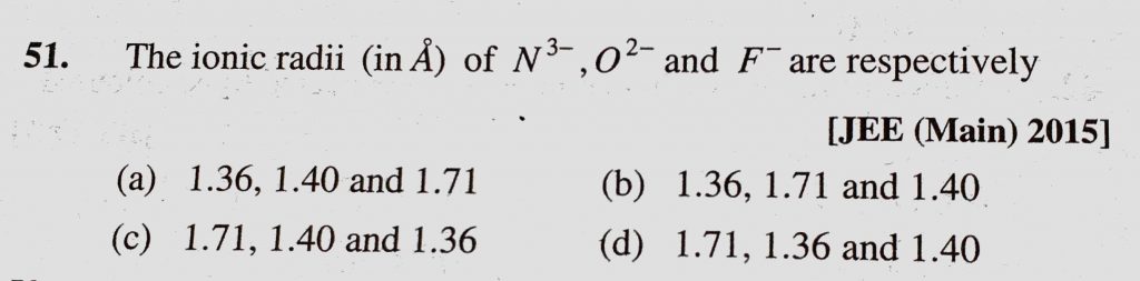 The ionic radii (in A) of N 3-, O 2- and F – are respectively (a) 1.36, 1.40 and 1.71 (b) 1.36, 1.71 and 1.40 (c) 1.71, 1.40 and 1.36 1.40 and 1.36 1.40 and 1.71 (b) 1.36 1.71 and 1.40 (c) 1.71 O 2- and F - are respectively (a) 1.36 The ionic radii (in A) of N 3- November 10, 2020 Category: Uncategorised (JEE Advanced Physics by BM Sharma + GMP Solutions) , Facebook Messenger WhatsApp Share this:TwitterFacebook Related