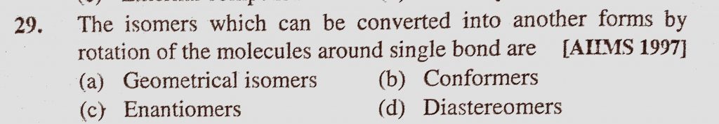 The isomers which can be converted into another forms by rotation of the molecules around single bond are (a) Geometrical isomers (b) Conformers The isomers which can be converted into another forms by rotation of the molecules around single bond are (a) Geometrical isomers (b) Conformers December 10, 2020 Category: Uncategorised (JEE Advanced Physics by BM Sharma + GMP Solutions) , Facebook Messenger WhatsApp Share this:TwitterFacebook Related