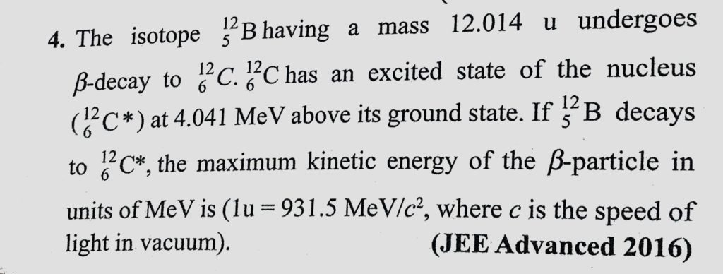 The isotope 12B5 having a mass 12.014 u undergoes beta decay to 12C6. 12C6 has an excited state of the nucleus 12C*6) at 4.041 MeV above its ground state. If 12B5 decays to 12C*6, The isotope 12B5 having a mass 12.014 u undergoes beta decay to 12C6. 12C6 has an excited state of the nucleus 12C*6) at 4.041 MeV above its ground state. If 12B5 decays to 12C*6 October 20, 2020 Category: Uncategorised (JEE Advanced Physics by BM Sharma + GMP Solutions) , Facebook Messenger WhatsApp Share this:TwitterFacebook Related