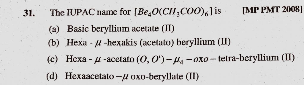 The IUPAC for (Be4O(CH3COO)6) is (a) Basic beryllium acetate (II) (b) Hexa-mu-hexakis (acetato) beryllium(II) The IUPAC for (Be4O(CH3COO)6) is (a) Basic beryllium acetate (II) (b) Hexa-mu-hexakis (acetato) beryllium(II) December 4, 2020 Category: Uncategorised (JEE Advanced Physics by BM Sharma + GMP Solutions) , Facebook Messenger WhatsApp Share this:TwitterFacebook Related
