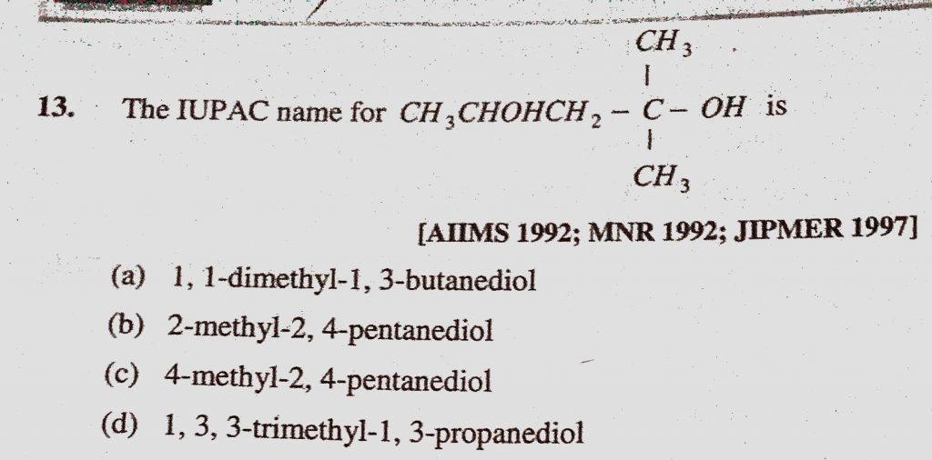 The IUPAC name for is (a) 1, 1-dimethyl-1, 3- butanediol (b) 2-methyl-2, 4-pentanediol 1-dimethyl-1 3- butanediol (b) 2-methyl-2 4-pentanediol The IUPAC name for is (a) 1 December 10, 2020 Category: Uncategorised (JEE Advanced Physics by BM Sharma + GMP Solutions) , Facebook Messenger WhatsApp Share this:TwitterFacebook Related