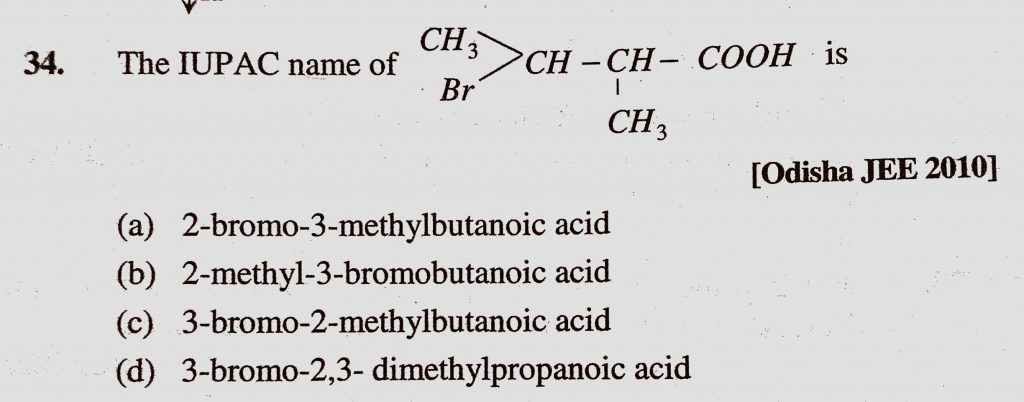 The IUPAC name of is (a) 2-bromo-3-methylbutanoic acid (b) 2-methyl-3-bromobutanoic acid (c) 3-bromo-2-methylbutanoic acid The IUPAC name of is (a) 2-bromo-3-methylbutanoic acid (b) 2-methyl-3-bromobutanoic acid (c) 3-bromo-2-methylbutanoic acid December 11, 2020 Category: Uncategorised (JEE Advanced Physics by BM Sharma + GMP Solutions) , Facebook Messenger WhatsApp Share this:TwitterFacebook Related