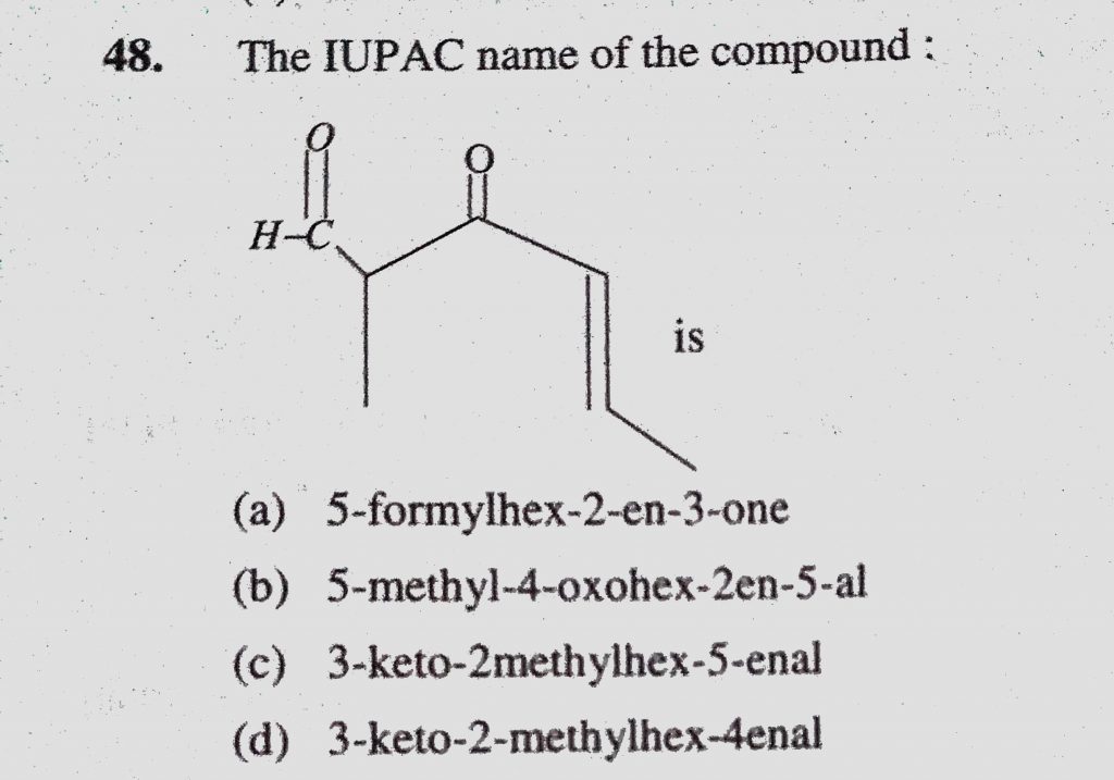 The IUPAC name of the compound : (a) 5-formylhex-2-en-3-one (b) 5-methyl-4-oxohex-2en-5-al The IUPAC name of the compound : (a) 5-formylhex-2-en-3-one (b) 5-methyl-4-oxohex-2en-5-al December 10, 2020 Category: Uncategorised (JEE Advanced Physics by BM Sharma + GMP Solutions) , Facebook Messenger WhatsApp Share this:TwitterFacebook Related