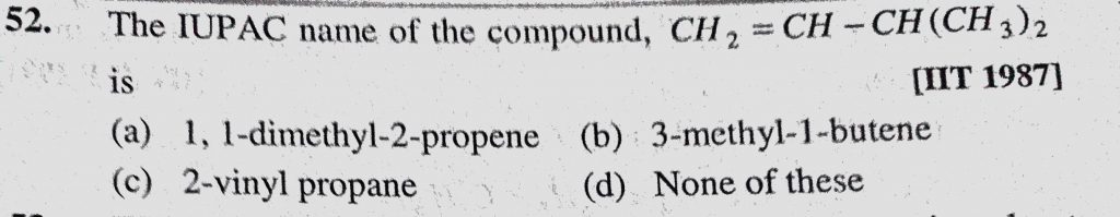 The IUPAC name of the compound CH2 = CH – CH (CH3)2 is (a) 1, 1-dimethyl-2-propene (b) 3-methyl-1-butene 1-dimethyl-2-propene (b) 3-methyl-1-butene The IUPAC name of the compound CH2 = CH - CH (CH3)2 is (a) 1 December 11, 2020 Category: Uncategorised (JEE Advanced Physics by BM Sharma + GMP Solutions) , Facebook Messenger WhatsApp Share this:TwitterFacebook Related