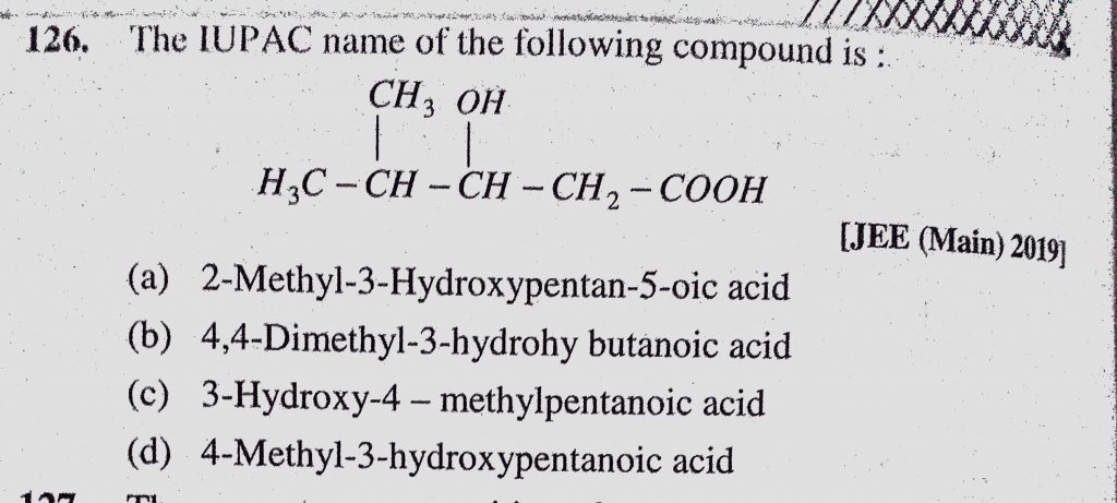 The IUPAC name of the following compound is : (a) 2-Methyl-3-Hydroxypentan-5-oic acid (b) 4, 4-Dimethyl-3-hydrohy butanoic acid 4-Dimethyl-3-hydrohy butanoic acid The IUPAC name of the following compound is : (a) 2-Methyl-3-Hydroxypentan-5-oic acid (b) 4 December 12, 2020 Category: Uncategorised (JEE Advanced Physics by BM Sharma + GMP Solutions) , Facebook Messenger WhatsApp Share this:TwitterFacebook Related