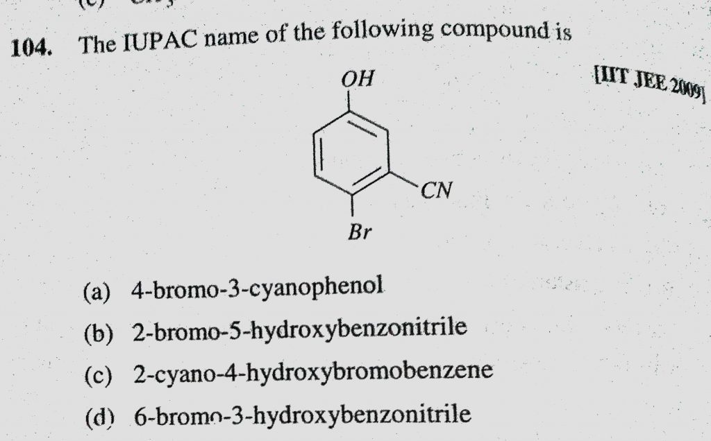 The IUPAC name of the following compound is (a) 4-bromo-3-cyanophenol (b) 2-bromo-5-hydroxybenzonitrile The IUPAC name of the following compound is (a) 4-bromo-3-cyanophenol (b) 2-bromo-5-hydroxybenzonitrile December 11, 2020 Category: Uncategorised (JEE Advanced Physics by BM Sharma + GMP Solutions) , Facebook Messenger WhatsApp Share this:TwitterFacebook Related