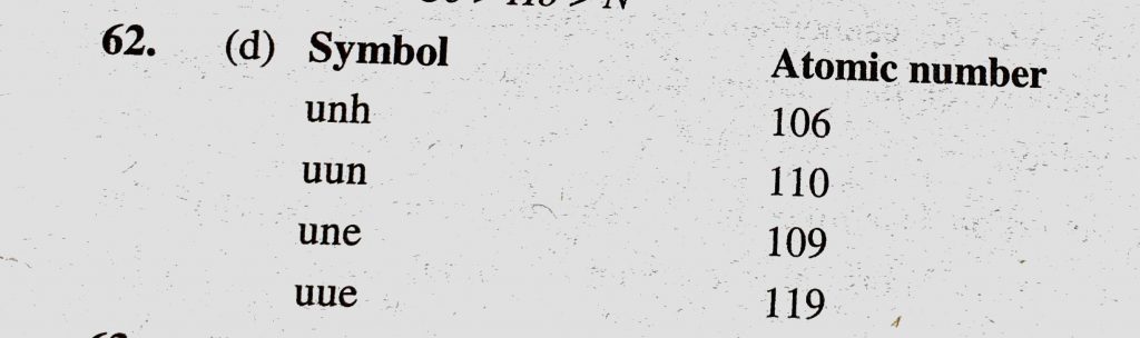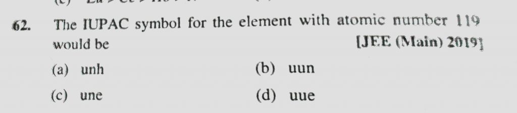 The IUPAC symbol for the element with atomic number 119 would be (a) unh (b) uun (c) une (d) uue The IUPAC symbol for the element with atomic number 119 would be (a) unh (b) uun (c) une (d) uue November 11, 2020 Category: Uncategorised (JEE Advanced Physics by BM Sharma + GMP Solutions) , Facebook Messenger WhatsApp Share this:TwitterFacebook Related