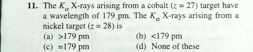 The K alpha X -ray arising from a cobalt ( z = 27 ) target have a wavelength of 179 Pm. The K alpha X -ray arising from a nickel target (z =28) is The K alpha X -ray arising from a cobalt ( z = 27 ) target have a wavelength of 179 Pm. The K alpha X -ray arising from a nickel target (z =28) is September 14, 2020 Category: Uncategorised (JEE Advanced Physics by BM Sharma + GMP Solutions) , Facebook Messenger WhatsApp Share this:TwitterFacebook Related