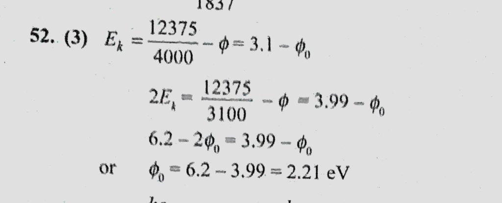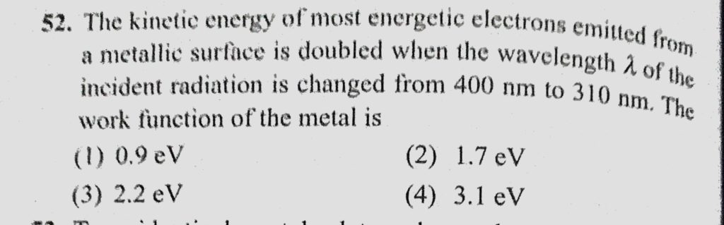 The kinetic energy of most energetic electrons emitted from a metallic surface is doubled when the wavelength lemda of the incident radiation is changed from 400 nm to 310 nm. The work The kinetic energy of most energetic electrons emitted from a metallic surface is doubled when the wavelength lemda of the incident radiation is changed from 400 nm to 310 nm. The work October 14, 2020 Category: Uncategorised (JEE Advanced Physics by BM Sharma + GMP Solutions) , Facebook Messenger WhatsApp Share this:TwitterFacebook Related