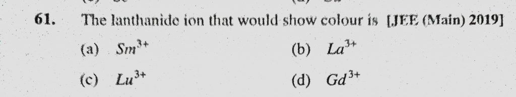 The lanthanide ion that would show colour is (a) Sm 3+ (b) La 3+ (c) Lu 3+ (d) Gd 3+ The lanthanide ion that would show colour is (a) Sm 3+ (b) La 3+ (c) Lu 3+ (d) Gd 3+ December 2, 2020 Category: Uncategorised (JEE Advanced Physics by BM Sharma + GMP Solutions) , Facebook Messenger WhatsApp Share this:TwitterFacebook Related