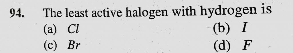 The least active halogen with hydrogen is (a) Cl (b) I (c) Br (d) F The least active halogen with hydrogen is (a) Cl (b) I (c) Br (d) F November 24, 2020 Category: Uncategorised (JEE Advanced Physics by BM Sharma + GMP Solutions) , Facebook Messenger WhatsApp Share this:TwitterFacebook Related