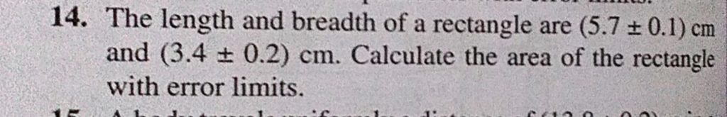 The length and breadth of a rectangle are (5.7 +- 0.1) cm and (3.4 +- 0.2) cm. Calculate the area of the rectangle with error limits. The length and breadth of a rectangle are (5.7 +- 0.1) cm and (3.4 +- 0.2) cm. Calculate the area of the rectangle with error limits. September 14, 2020 Category: Uncategorised (JEE Advanced Physics by BM Sharma + GMP Solutions) , Facebook Messenger WhatsApp Share this:TwitterFacebook Related