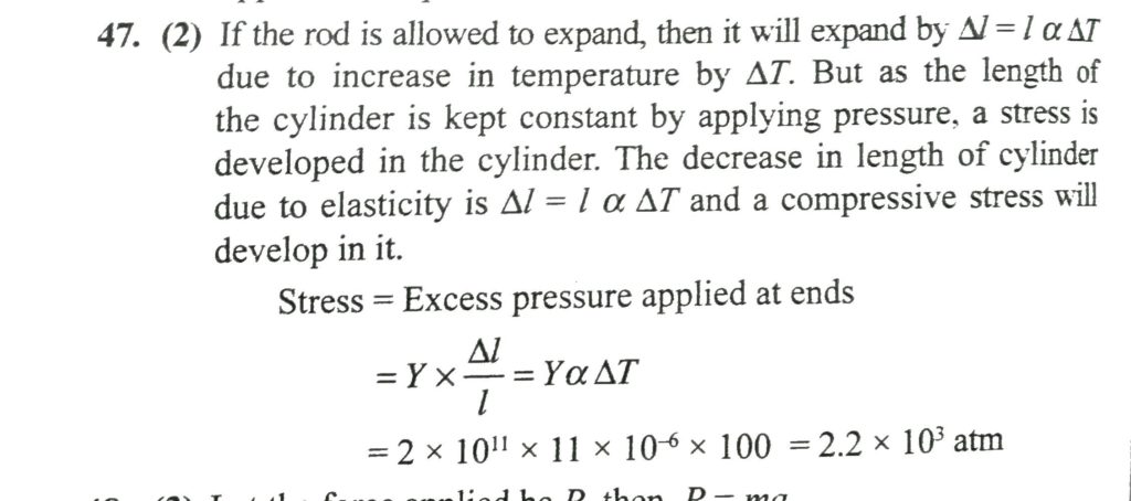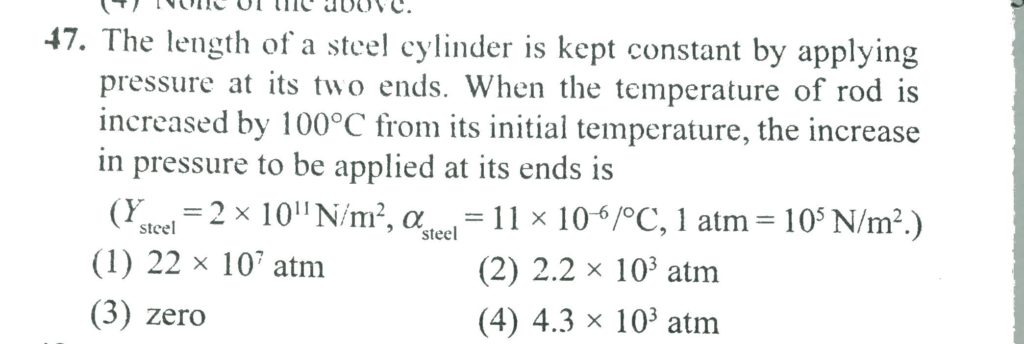 The length of a steel cylinder is kept constant by applying pressure at its two ends. When the temperature of rod is increased by 100 ∘ C from its initial temperature, the increase in pressure to be applied at its ends is (Y sted = 2 ×10^ 11 N/m ^ 2 , α steel 11 × 10 ^ −6 % C ,1 atm = 10 ^5 N/m ^2 )