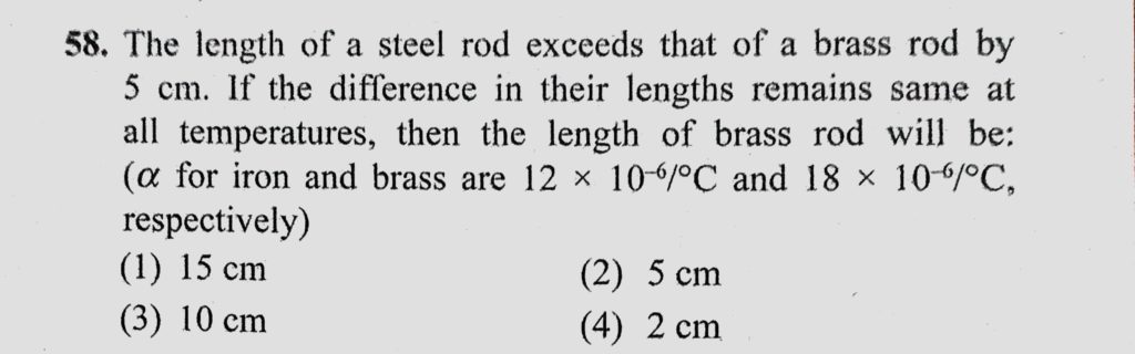 The length of a steel rod exceeds that of a brass rod by 5 cm. If the difference in their lengths remains same at all temperatures, then the length of brass rod will be: (alpha for iron and brass The length of a steel rod exceeds that of a brass rod by 5 cm. If the difference in their lengths remains same at all temperatures then the length of brass rod will be: (alpha for iron and brass October 24, 2020 Category: Uncategorised (JEE Advanced Physics by BM Sharma + GMP Solutions) , Facebook Messenger WhatsApp Share this:TwitterFacebook Related