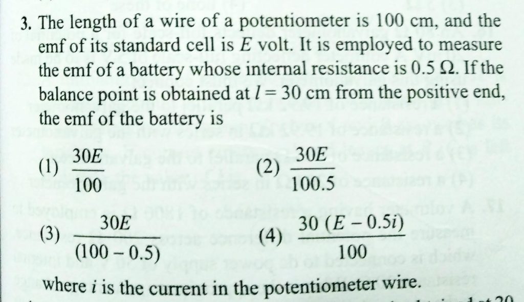 The length of a wire of a potentiometer is 100 cm, and the emf of its standard cell is E volt. It is employed to measure the emf of a battery whose internal resistance is 0.5Ω. If the balance point is obtained at l=30 cm from the positive end, the emf of the battery is
