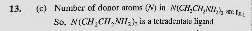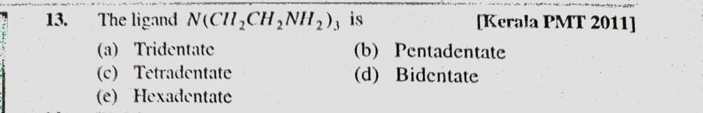 The ligand N(CH2CH2NH2)3 is (a) Tridentate (b) Pentadenate (c) Tetradentate (d) Bidentate The ligand N(CH2CH2NH2)3 is (a) Tridentate (b) Pentadenate (c) Tetradentate (d) Bidentate December 3, 2020 Category: Uncategorised (JEE Advanced Physics by BM Sharma + GMP Solutions) , Facebook Messenger WhatsApp Share this:TwitterFacebook Related