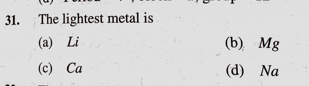 The lightest metal is (a) Li (b) Mg (c) Ca (d) Na The lightest metal is (a) Li (b) Mg (c) Ca (d) Na November 8, 2020 Category: Uncategorised (JEE Advanced Physics by BM Sharma + GMP Solutions) , Facebook Messenger WhatsApp Share this:TwitterFacebook Related