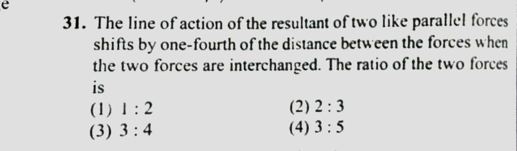 The line of action of the resultant of two like parallel forces shifts by one-fourth of the distance between the forces when the two forces are interchanged. The ratio of the two forces is: The line of action of the resultant of two like parallel forces shifts by one-fourth of the distance between the forces when the two forces are interchanged. The ratio of the two forces is: September 26, 2020 Category: Uncategorised (JEE Advanced Physics by BM Sharma + GMP Solutions) , Facebook Messenger WhatsApp Share this:TwitterFacebook Related