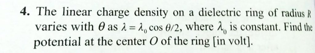 The linear charge density on a dielectric ring of radius R varies with theta as lamda = lamda 0 cos theta /2 , where lamda0 is constant . Find the potential at the center O of the ring [ in volt ] . The linear charge density on a dielectric ring of radius R varies with theta as lamda = lamda 0 cos theta /2 where lamda0 is constant . Find the potential at the center O of the ring [ in volt ] . November 6, 2020 Category: Uncategorised (JEE Advanced Physics by BM Sharma + GMP Solutions) , Facebook Messenger WhatsApp Share this:TwitterFacebook Related