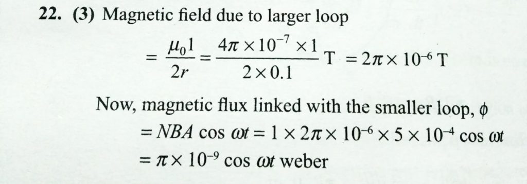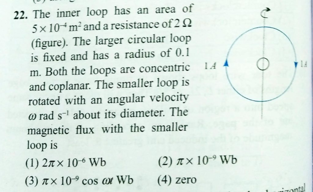 The linear loop has an area of 5×10^−4 m^2 and a resistance of 2 Ω. The larger circular loop is fixed and has a radius of 0.1m. Both the loops are concentric and coplanner. The smaller loop is rotated with an angular velocity ω rad/s about its diameter. The magnetic flux with the smaller loop is