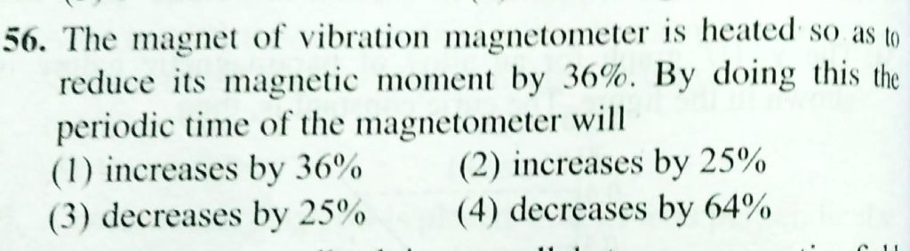 The magnet of a vibration magnetometer is heated so as to reduce its magnetic moment by 36 %. By doing this the period time of the magnetometer will The magnet of a vibration magnetometer is heated so as to reduce its magnetic moment by 36 %. By doing this the period time of the magnetometer will October 18, 2020 Category: Uncategorised (JEE Advanced Physics by BM Sharma + GMP Solutions) , Facebook Messenger WhatsApp Share this:TwitterFacebook Related