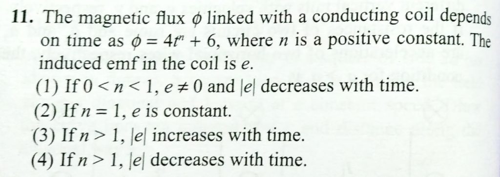 The magnetic flux ϕ linked with a conducting coil depends on time as ϕ = 4 t n +6, where n is a positive constant. The induced emf in the coil is e. The magnetic flux ϕ linked with a conducting coil depends on time as ϕ = 4 t n +6 where n is a positive constant. The induced emf in the coil is e. October 21, 2020 Category: Uncategorised (JEE Advanced Physics by BM Sharma + GMP Solutions) , Facebook Messenger WhatsApp Share this:TwitterFacebook Related