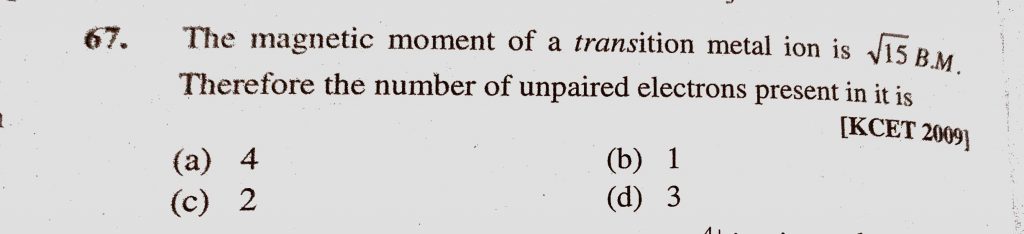The magnetic moment of a transition metal ion is root 15 B.M. Therefore the number of unpaired electrons present in it is (a) 4 (b) 1 (c) 2 (d) 3 The magnetic moment of a transition metal ion is root 15 B.M. Therefore the number of unpaired electrons present in it is (a) 4 (b) 1 (c) 2 (d) 3 December 4, 2020 Category: Uncategorised (JEE Advanced Physics by BM Sharma + GMP Solutions) , Facebook Messenger WhatsApp Share this:TwitterFacebook Related