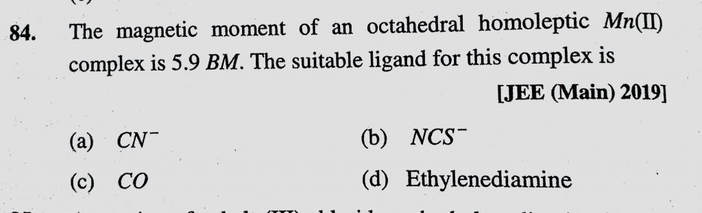 The magnetic moment of an octahedral homoleptic Mn(II) complex is 5.9 BM. The suitable ligand for this complex is The magnetic moment of an octahedral homoleptic Mn(II) complex is 5.9 BM. The suitable ligand for this complex is December 5, 2020 Category: Uncategorised (JEE Advanced Physics by BM Sharma + GMP Solutions) , Facebook Messenger WhatsApp Share this:TwitterFacebook Related