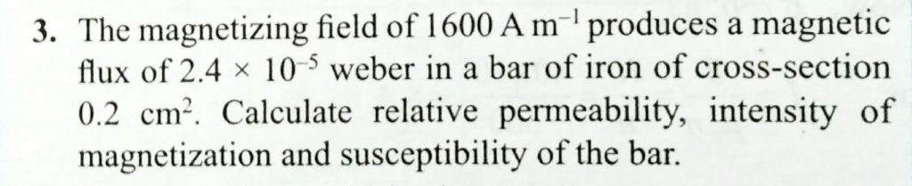 The magnetizing field of 1600 A/m produces a magnetic flux of 2.4 x 10^-5 Weber in a bar of ioron of cross – section 0.2 cm^2. calculate relative permeability, intensity of magnetization and susceptibility of the bar . intensity of magnetization and susceptibility of the bar . The magnetizing field of 1600 A/m produces a magnetic flux of 2.4 x 10^-5 Weber in a bar of ioron of cross - section 0.2 cm^2. calculate relative permeability October 18, 2020 Category: Uncategorised (JEE Advanced Physics by BM Sharma + GMP Solutions) , Facebook Messenger WhatsApp Share this:TwitterFacebook Related