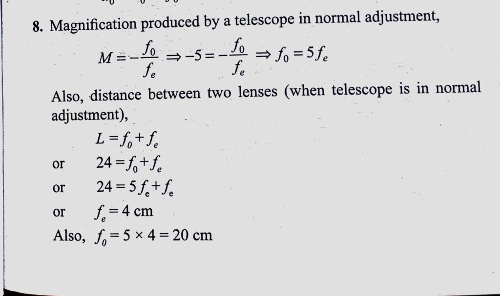 The magnifying power of an astronomical telescope is 5. When it is set for normal adjustment, the distance between the two lenses is 24 cm. Calculate the focal length of its eyepiece and that of its the distance between the two lenses is 24 cm. Calculate the focal length of its eyepiece and that of its The magnifying power of an astronomical telescope is 5. When it is set for normal adjustment October 8, 2020 Category: Uncategorised (JEE Advanced Physics by BM Sharma + GMP Solutions) , Facebook Messenger WhatsApp Share this:TwitterFacebook Related