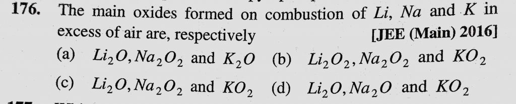 The main oxides formed on combustion of Li, Na and K in excess of air are, respectively (a) Li2O, Na2O2 and K2O Na and K in excess of air are Na2O2 and K2O respectively (a) Li2O The main oxides formed on combustion of Li November 28, 2020 Category: Uncategorised (JEE Advanced Physics by BM Sharma + GMP Solutions) , Facebook Messenger WhatsApp Share this:TwitterFacebook Related