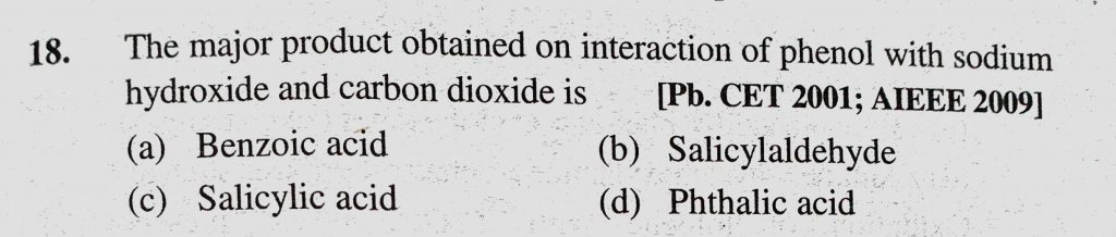 The major product obtained on interaction of phenol with sodium hydroxide and carbon dioxide is (a) Benzoic acid (b) Salicylaldehyde (c) Salicylic acid (d) Phthalic acid The major product obtained on interaction of phenol with sodium hydroxide and carbon dioxide is (a) Benzoic acid (b) Salicylaldehyde (c) Salicylic acid (d) Phthalic acid February 13, 2021 Category: Uncategorised (JEE Advanced Physics by BM Sharma + GMP Solutions) , Facebook Messenger WhatsApp Share this:TwitterFacebook Related