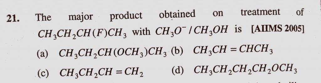 The major product obtained on treatment of CH3CH2CH(F)CH3 with CH3O-/CH3OH is (a) CH3CH2CH(OCH3)CH3 (b) CH3CH = CHCH3 (c) CH3CH2CH = CH2 The major product obtained on treatment of CH3CH2CH(F)CH3 with CH3O-/CH3OH is (a) CH3CH2CH(OCH3)CH3 (b) CH3CH = CHCH3 (c) CH3CH2CH = CH2 December 17, 2020 Category: Uncategorised (JEE Advanced Physics by BM Sharma + GMP Solutions) , Facebook Messenger WhatsApp Share this:TwitterFacebook Related